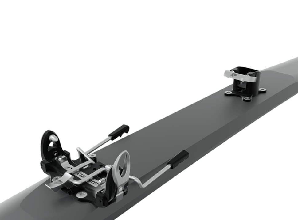 Новият механизъм на петата осигурява безопасно странично и вертикално освобождаване на ски обувката. В режим на изкачване е възможна регулация на позицията на крака.