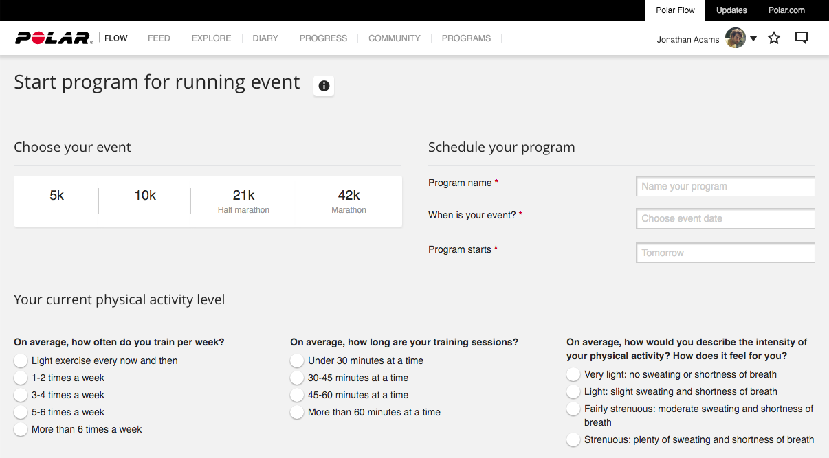 Изпробвайте различни комбинации между тези два показателя, планираното събитие и датата на събитието, за да разберете какъв тип ще бъде вашия тренировъчен план. Ако сте нов потребител в Polar Flow и нямате тренировъчна история в профила си, отговорете на въпросите, свързани с вашите показатели и ще получите план, който да отговаря на вашето ниво на активност.