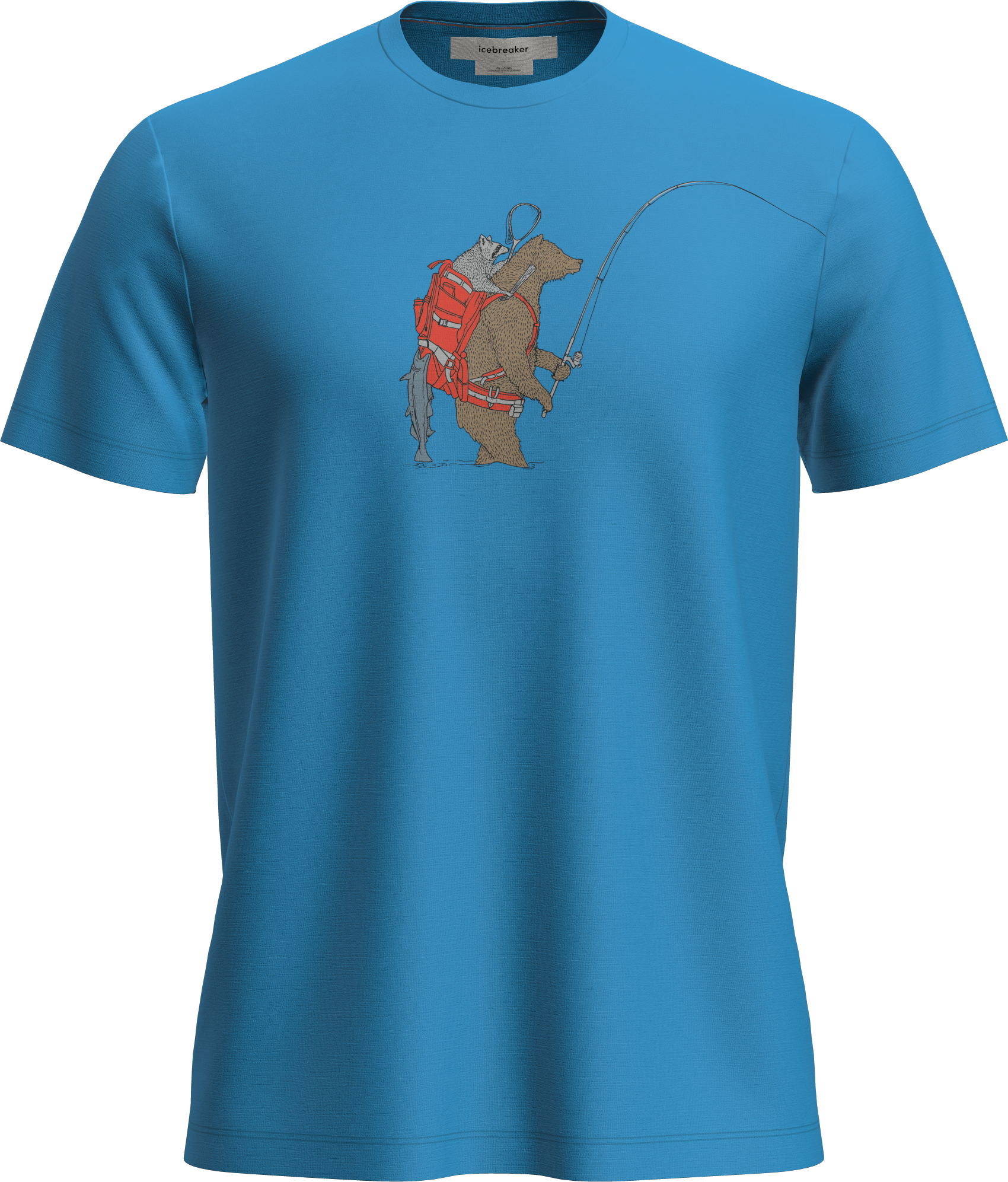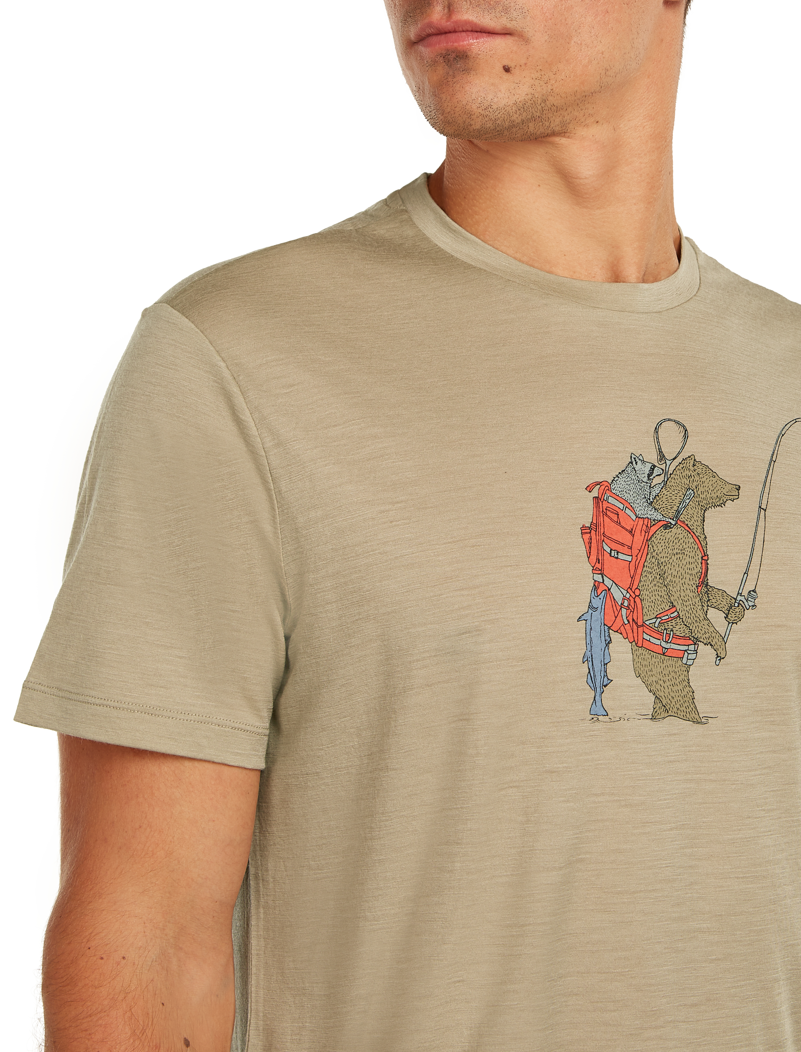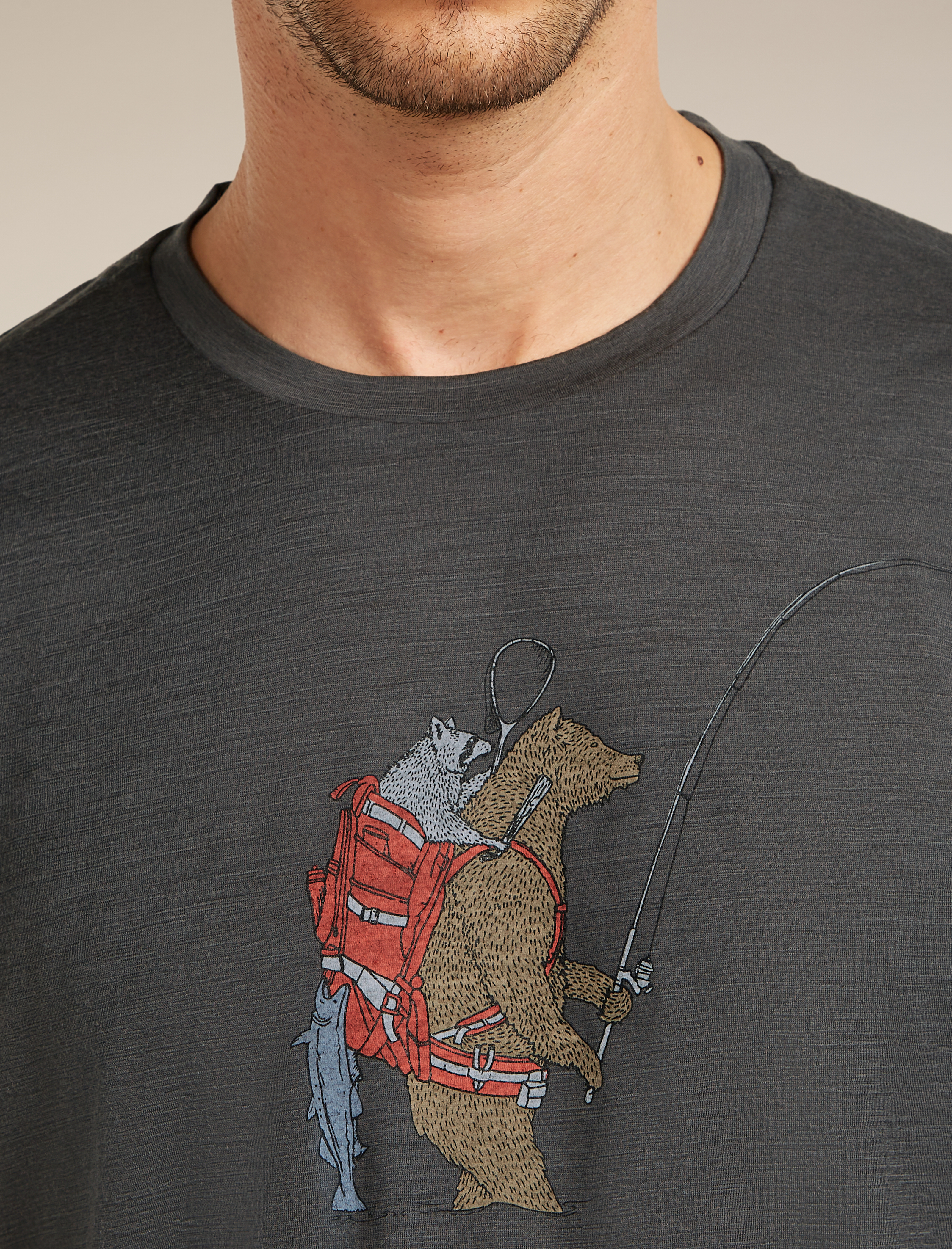 The Bear Catch graphic adds a distinctive visual touch, blending a casual outdoor style with a nature inspired design. Offset shoulder seams help reduce friction and improve comfort during extended wear.