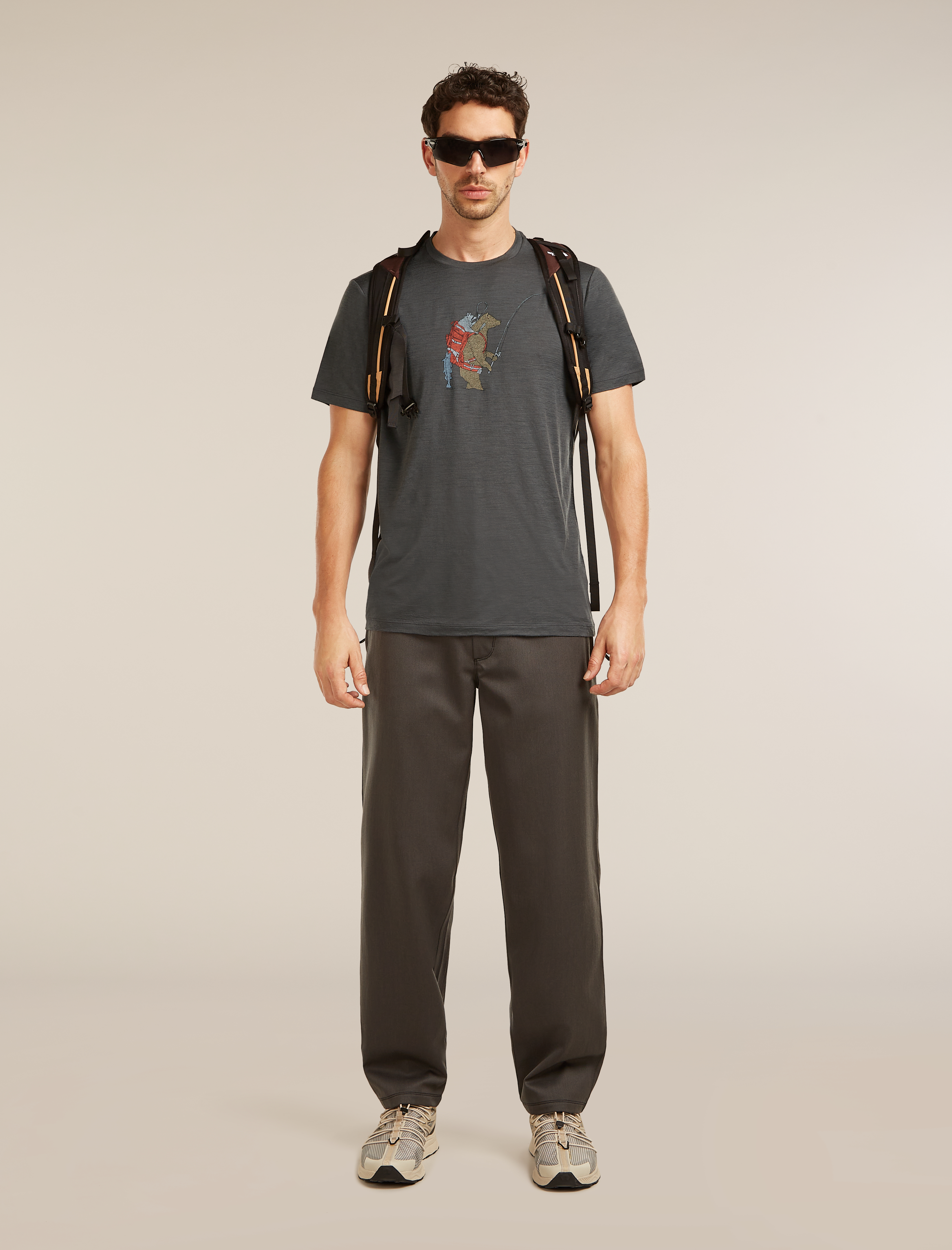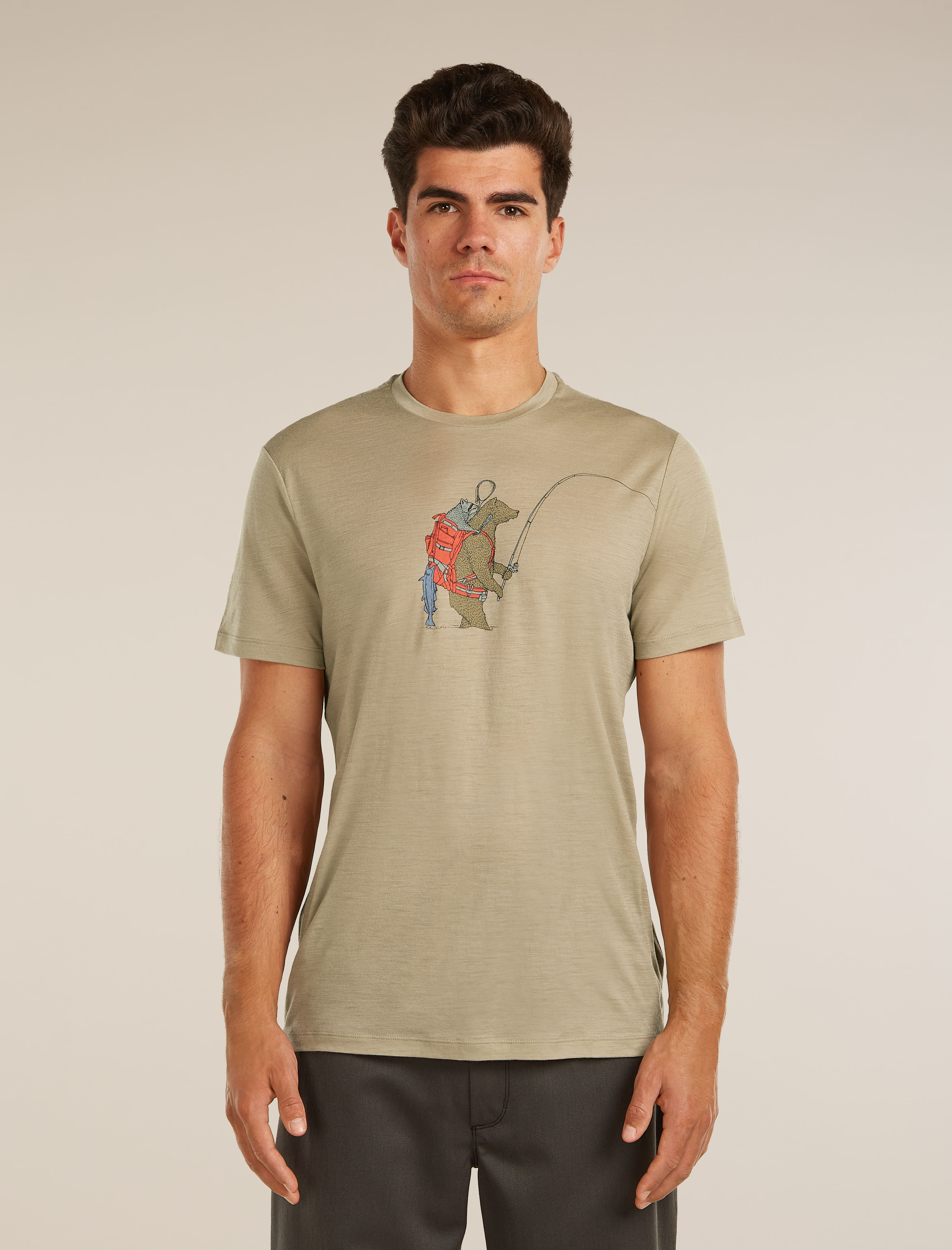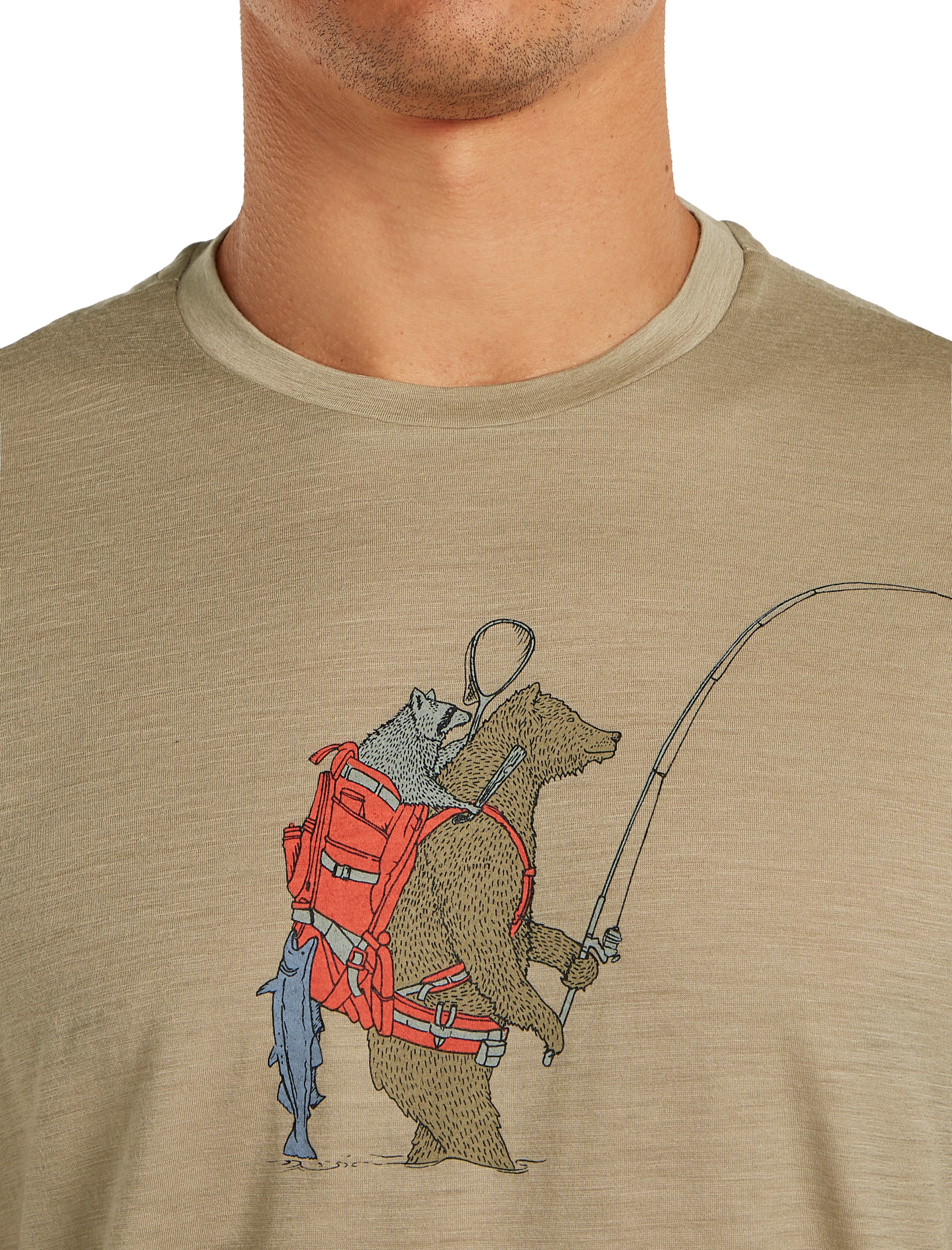 The Bear Catch graphic adds a distinctive visual touch, blending a casual outdoor style with a nature inspired design. Offset shoulder seams help reduce friction and improve comfort during extended wear.