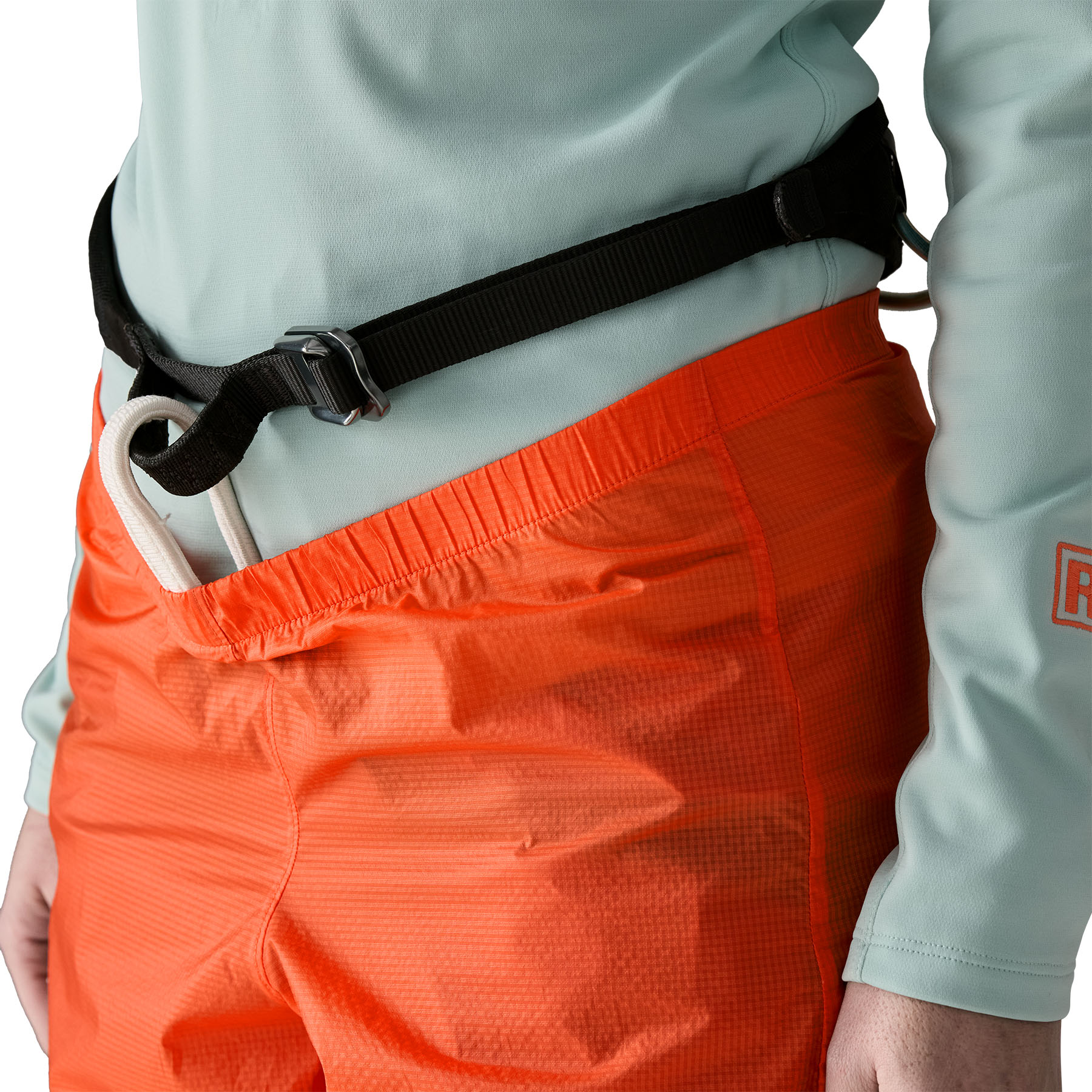 Elastic waistband is designed to pull easily over a harness with room for belay loop access - Zippered Thigh Pocket